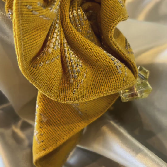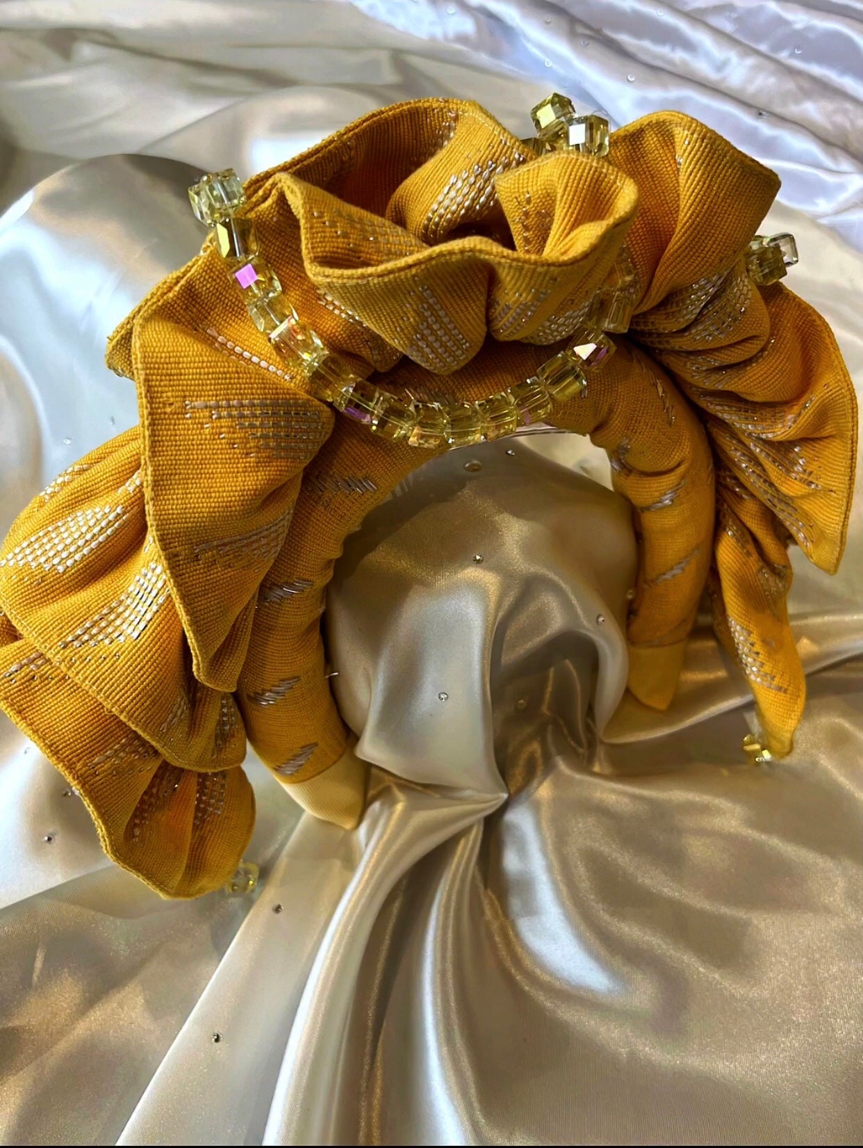 The Eemi Headband is a striking headband handcrafted with care. Wrapped in Aso-Oke—a traditional Yoruba textile from Nigeria—and adorned with clear coloured beads, this headband brings culture and elegance together in one striking piece.